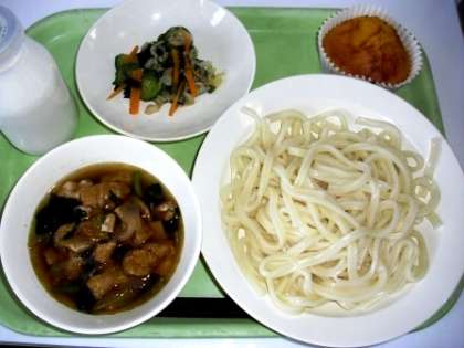 ここのところ日中は気温が高くなる日が続き、水冷したうどんを温かい汁につけて食べるつけめん風のうどんはとても喜ばれました。ほとんどのクラスから、空っぽの食缶が却ってきました。
