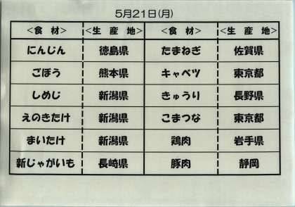 5月18日(金)の給食と21日(月)給食食材の産地について