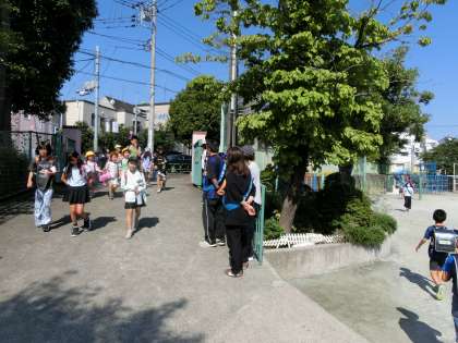 代表児童が中心となり、門のところでみんなであいさつをしています。気持ちのよいあいさつができるように心がけています。