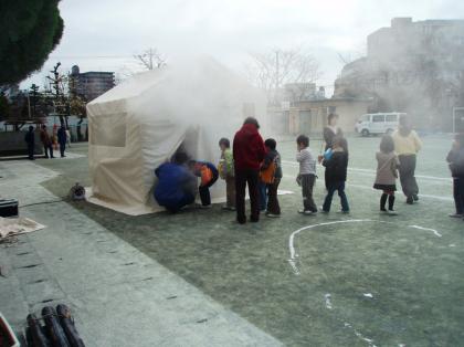 玉川支所地域・振興課に依頼をして、煙ハウスを準備していただいています。人工的に発生させた煙(体への害のないものを利用しています)の中をくぐりぬけ、姿勢を低くすることを体験します。