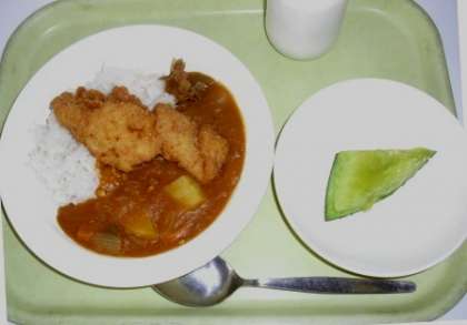前日の25日(金)は、給食室からの応援の気持ちを込めて「チキンカツカレー、メロン、牛乳」という献立でした。カレーが、いつもより少し辛く仕上がってしまい、低学年の児童には申し訳なかったです。
