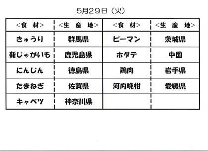 5月25日(金)の給食と29日(火)給食食材の産地について