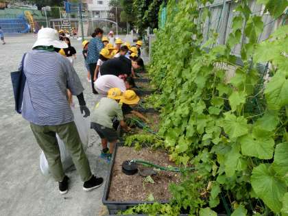 子どもたちが、花壇の雑草の手入れをしました。たくさんの子どもたちがお手伝いをしていました。
