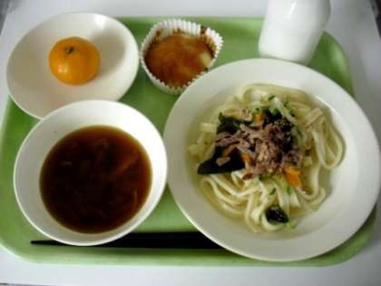 5日(火)「和風だしのつけきしめん」は、煮干しと厚削り節でとった和風だしをベースにしたつけ汁に、きしめん、具材(野菜と焼き豚)をつけて食べました。これは大人気で、うどんの残りはとても少なかったです。