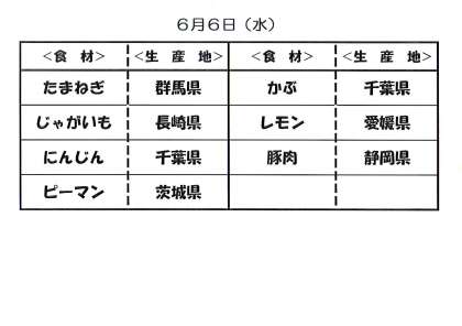 6月5日(火)の給食と6日(水)給食食材の産地について