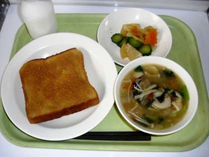 6月11日(月)の献立は『黒糖きなこゴマトースト、明日葉うどんのとろみ汁、シャキシャキ野菜、牛乳』でした。