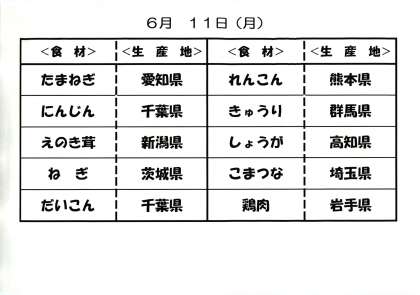 11日(月)の給食で使用した食材の主な産地は以下の通りです。