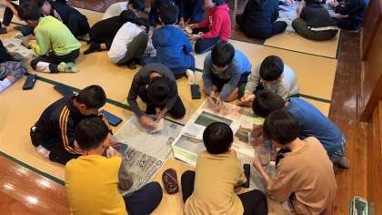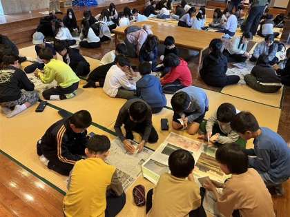 雨のため、午前中に予定されていたますつかみが中止になってしまったので、室内でコースターづくりに取り組んでいます。紙やすりを使い、木の表面をツルツルに削っています。
