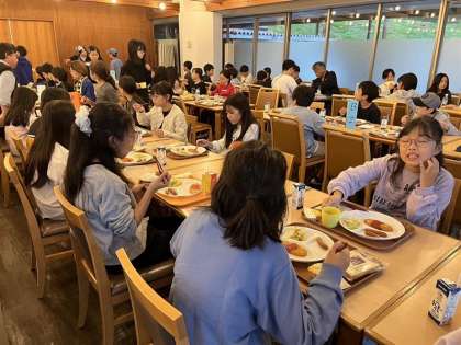 本日の朝食の様子です。この後閉室式があり、屋根付き広場で箸づくりを予定しています。