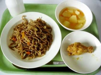 13日の給食は、塩焼きそば、タンドリーチキン、フルーツポンチでした。