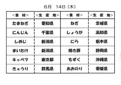 14日(木)の給食献立は「焼き豚ときのこのおこわ、もずくとにらのすまし汁、野菜の中華かけ、牛乳」です。主な食材の産地は以下の通りです。