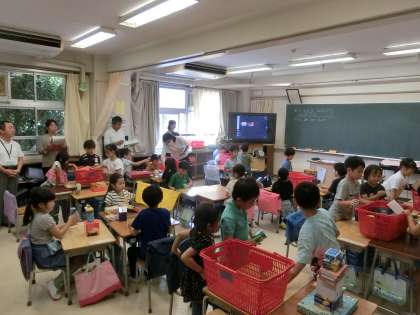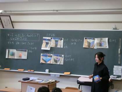 本日は校内研究会が行われ、1年生の算数「かたちあそび」の授業を教員全員で見ました。たくさんの箱型のものからなかまわけをし、一生懸命考えながら学習に取り組んでいました。
