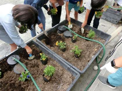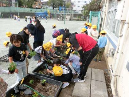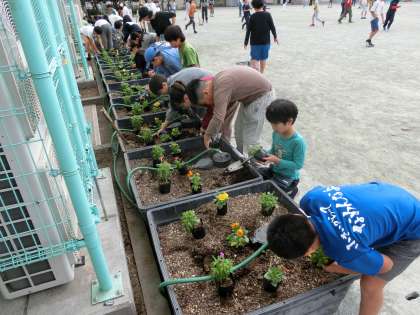 今日は、さいばいDAYの日でした。新しく土が入れ替えられたプランターに、子どもたちが花の苗を植えました。先生方も一緒になって、たくさんの子どもたちが花の苗を植えるお手伝いをしていました。