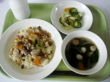 14日(木)は「焼き豚ときのこのおこわ、もずくとにらのすまし汁、野菜の中華かけ、牛乳」でした。きのこの入った料理は子どもに敬遠されがちですが、甘めの味付けと焼き豚の入ったモチモチしたおこわのせいか、とても残りが少なかったです。