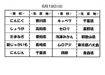 6月18日(月)の給食と19日(火)給食食材の産地について