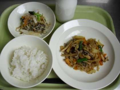 20日(水)の主菜「五目きんぴら煮」は、定番のごぼうとにんじんに以外に豚肉、じゃがいも、たけのこ、たまねぎ、糸こんにゃく、油揚げなどをゴマ油で炒め、きんぴらの味付けで仕上げたものです。彩りに飾ったいんげんも加えると、一品で9品目も入っています。