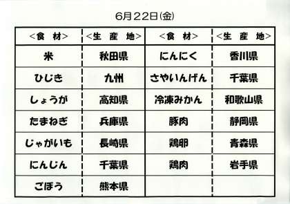 6月20日(水)の給食と22日(金)給食食材の産地について