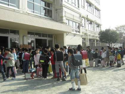 8時15分のチャイムがなるころには、長蛇の列ができていました。「早く学校へ行きたい」という子どもたちの気持ちを大切にします。