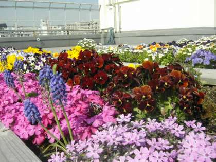 屋上庭園もパンジー、ビオラ、ノースポールなどが満開で、花の甘い香りに引き寄せられるようにひよどりが何羽も集まってきて蜜をすっていました。