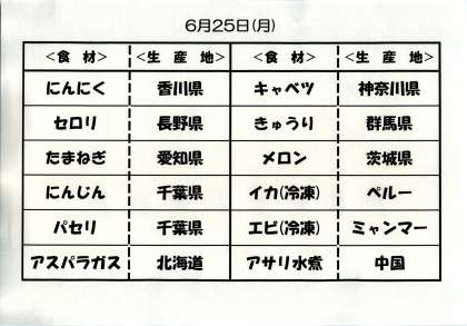 25日(月)の献立は「スパゲッティー地中海ソース、グリーンサラダ、メロン、牛乳」です。主な食材の産地は以下の通りです。