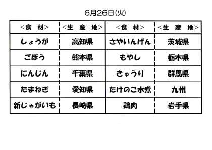 26日(火)の給食献立は、「ごはん、鶏肉と新じゃがのみそ煮、もやしとわかめの和え物、牛乳」です。主な食材の産地は以下の通りです。