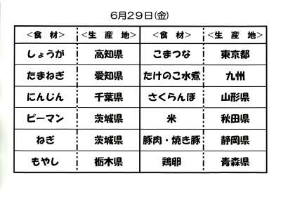 7月28日(木)の給食と29日(金)給食食材の産地について