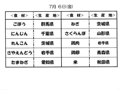 7月5日(木)の給食と7月6日(金)給食食材の産地について