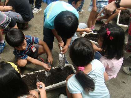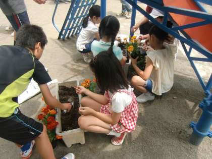 今日は20分休みに、さいばいDAYの活動がありました。栽培委員会が全校に呼びかけて各学年がプランタなどに夏の花の苗を植えました。これからの水やりも大変ですが、いつも花いっぱいの学校になるよう、大切に世話をしていきます。
