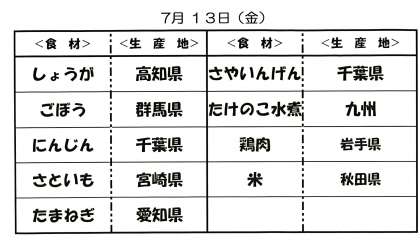 7月12日(木)の給食と13日(金)給食食材の産地について