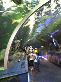 写真左は、トンネル水槽で感嘆の声をあげる子どもたち。