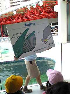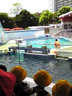 写真右は、イルカショーの様子です。イルカは、左側の陸(?)の上で回転しています。
