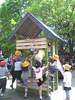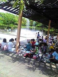 お弁当は、しながわ区民公園の噴水と藤棚の近くで食べました。けやきの新緑が美しい中で、ゆっくり味わいながら食べました。その後、30分ほどブランコやシーソーなどの遊具で遊びました。行き帰りの電車の中でのマナーもよく褒められました。