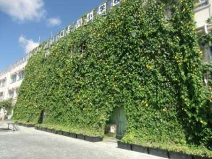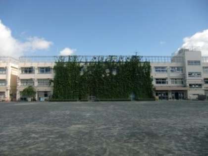 本校では、環境教育の取組の一つとして、緑のカーテンを設置していただいています。5月の連休のころから育て始め、今では屋上に届くくらいになりました。おかげで教室の室温も低く抑えることができています。