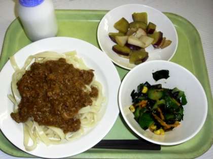 本日のメニューは「肉みそうどん、きゅうりとわかめの中華味、さつまいもとりんごの重ね煮、牛乳」でした。主な食材の産地は上記の通りです。