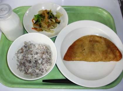 7日(金)の主菜は、本校で人気の高いメニューの一つ「ジャンボぎょうざ」でした。見た目にはわかりませんが、今回は具にひき肉ではなく、ムロアジのミンチを使いました。香味野菜もたっぷり入っているので、魚の臭みなどは全くなく、子どもたちは美味しそうに食べていました。