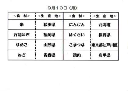 9月7日(金)の給食と10日(月)給食食材の産地について