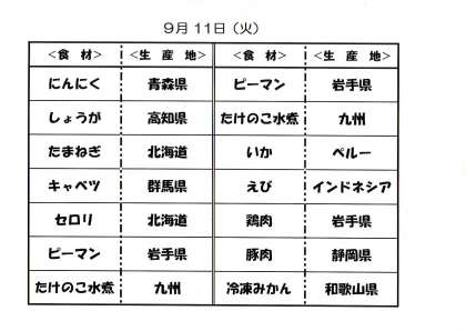 9月10日(月)の給食と11日(火)給食食材の産地について