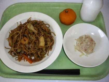 「エスニック焼きそば」は、イカやエビを使い、カレー粉とオイスターソースで味つけしました。「豆腐入り菊花シュウマイ」は、具に豆腐を加え、周りはシュウマイの皮を細長く切ったものをつけて蒸しました。新メニューでしたが、子どもたちにおいしく食べてもらえたようでした。