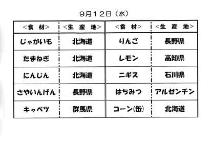 9月11日(火)の給食と12日(水)の給食食材の産地について