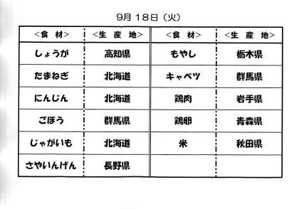 9月14日(金)の給食と18日(火)給食食材の産地について