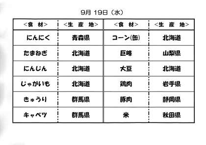 9月18日(火)の給食と19日(水)給食食材の産地について
