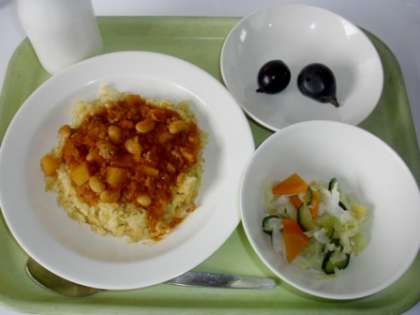 チリビーンズライスは、メキシコ料理のチリコンカンをご飯にかけたような料理です。小学校の給食なので、辛みは抑えて、ミートソースのような味わいです。大豆がたっぷり入っていましたが、1年生にも大人気。ここ最近では、カレーの日以来、ごはんの残りが最も少ない日でした。