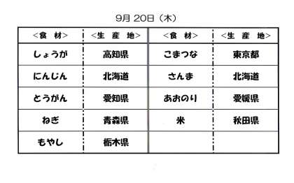 9月19日(水)の給食と20日(木)給食食材の産地について