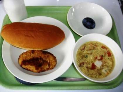 27日(木)は、ジャガイモから手作りで作ったコロッケを、切れ目の入ったパンにはさんで食べる「セルフコロッケサンド」、トマトや鶏肉の入った「豆腐と卵のスープ」、この時期しか出回らない生の「プルーン」がデザートでした。この日は4年生が社会科見学のため給食がなかったのですが、それでも約400個ものコロッケを作るのはとても大変です。コロッケの種を冷ます時間もなく、とてもやわらかい状態で整形、衣づけ、揚げる、という作業をし、クラスごとの食缶に入れていくというのは、とても大変でした。けれども、給食後に却ってきた食缶を開けてみると、どこのクラスも空っぽでした。パンの残りもいつもよりとても少なく、給食室全員で奮闘した甲斐がありました。