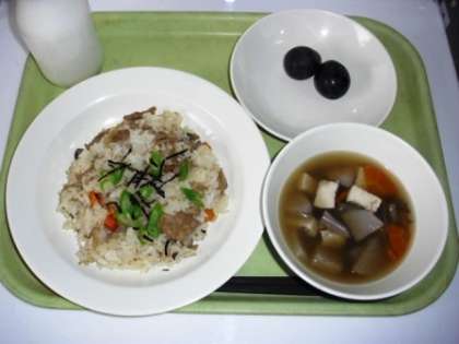 10月最初の給食は、「きのこと豚肉のばら寿司、けんちん汁、巨峰、牛乳」でした。秋においしい食材をたくさん取り入れました。今月は、きのこ、さつまいも、さといも、りんご、柿、ぶどうなどが給食にたびたび登場します。給食から子どもたちに「秋」を届けます。