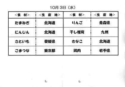 10月2日(火)の給食と3日(水)給食食材の産地について