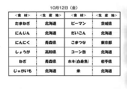 10月11日(木)の給食と12日(金)給食食材の産地について