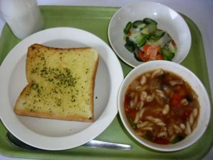 16日(火)はかくし味に練りゴマを加えた「セサミガーリックトースト」、たくさんの具の入った「ミネストローネ」、人気のバジル風味ドレッシングをかけた「イタリアンサラダ」、「牛乳」でした。セサミガーリックトーストは、いつものガーリックトースト同様よく食べていましたが、ミネストローネは少し残りが多くて残念でした。サラダは、比較的よく食べていたようです。