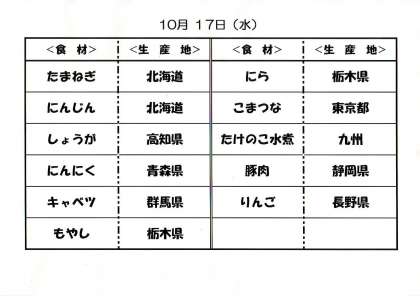 17日(水)の給食は、「キムチあんかけ焼きそば、塩ナムル、りんご、牛乳」です。主な食材の産地は以下の通りです。