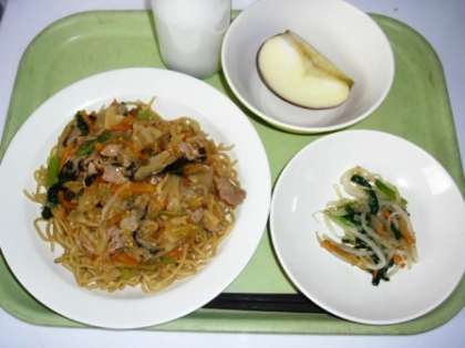 17(水)は、蒸した中華めんの上に、野菜たっぷりのキムチあんかけをかけた「キムチあんかけ焼きそば」、「塩ナムル」、「りんご」、「牛乳」でした。